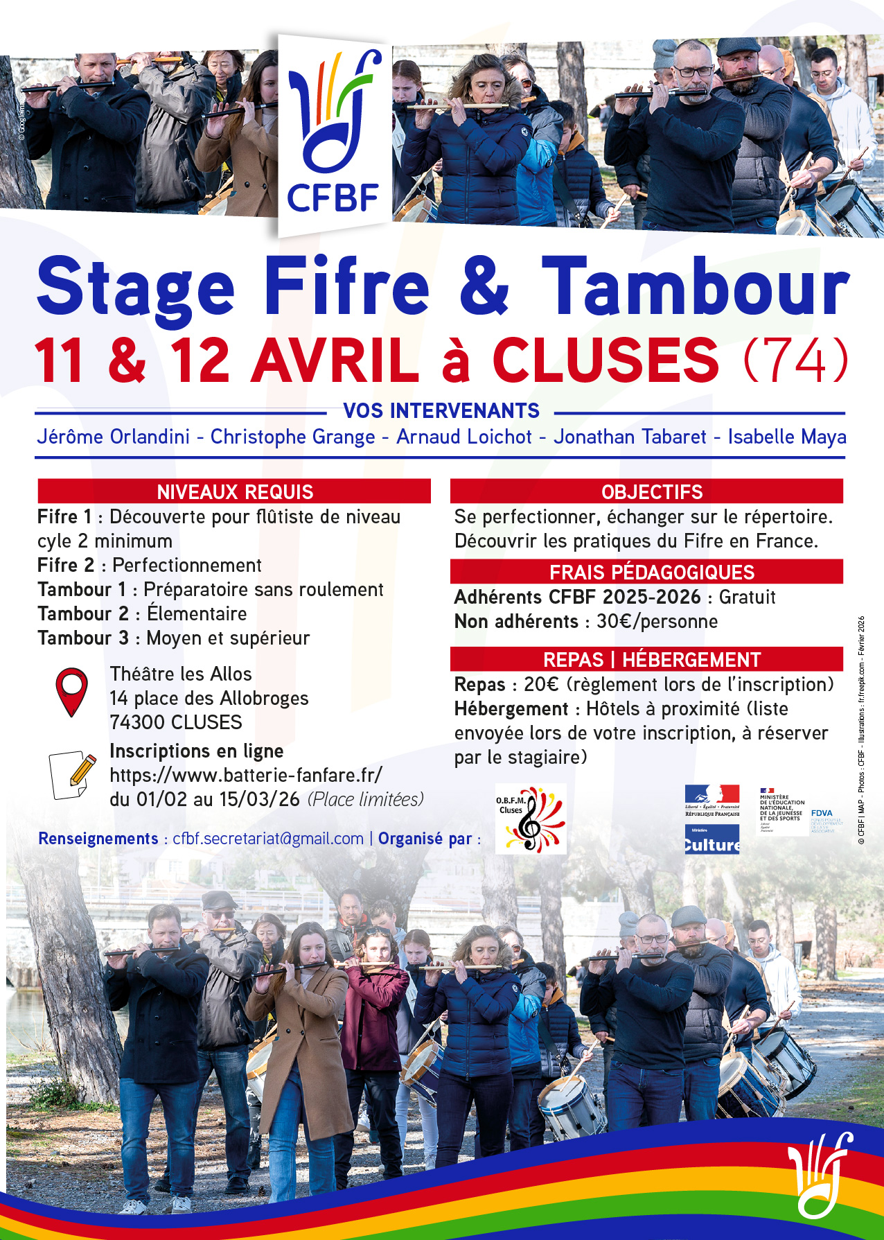 | Stage Fifres et Tambours | Le stage Fifres et Tambours aura lieu en mai à Cluses. Des informations supplémentaires vous seront données ultérieurement. | 1775865600 11.04.2026 13.04.2026 |