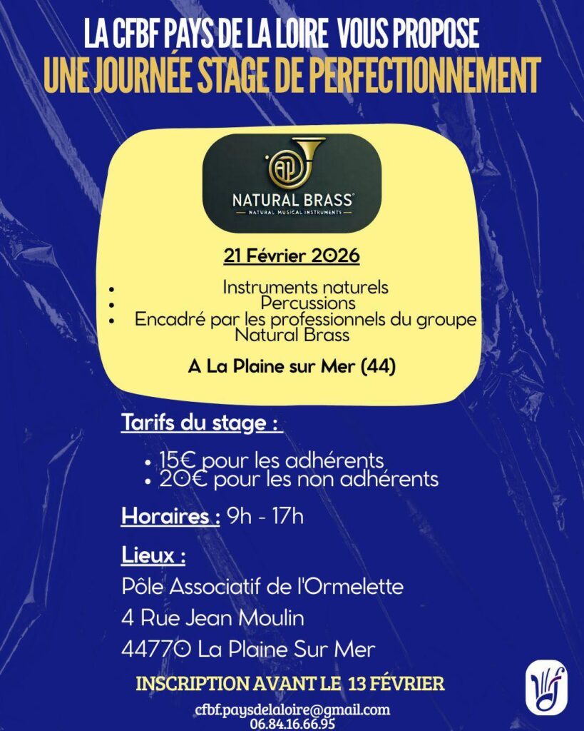 | Stage Cuivres Naturels | Nos amis de La Plaine-sur-Mer accueilleront un stage Cuivres naturels le 21 février. Plus d'informations à venir dans les mois Lire la suite… | 1771632000 21.02.2026 22.02.2026 |