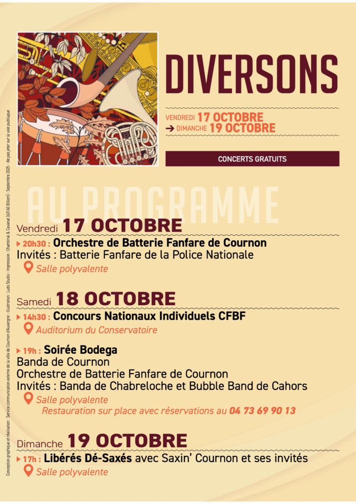 Du 17 au 19 octobre, Cournon d’Auvergne organise le Festival DiverSons avec au programme : Venez nombreux passer un week-end musical au pied des volcans d’Auvergne ! Partagez ce contenu Partager ce contenu Ouvrir dans une autre fenêtre Ouvrir dans une autre fenêtre Ouvrir dans une autre fenêtre Read more articles Article précédentVotre avis nous intéresse…