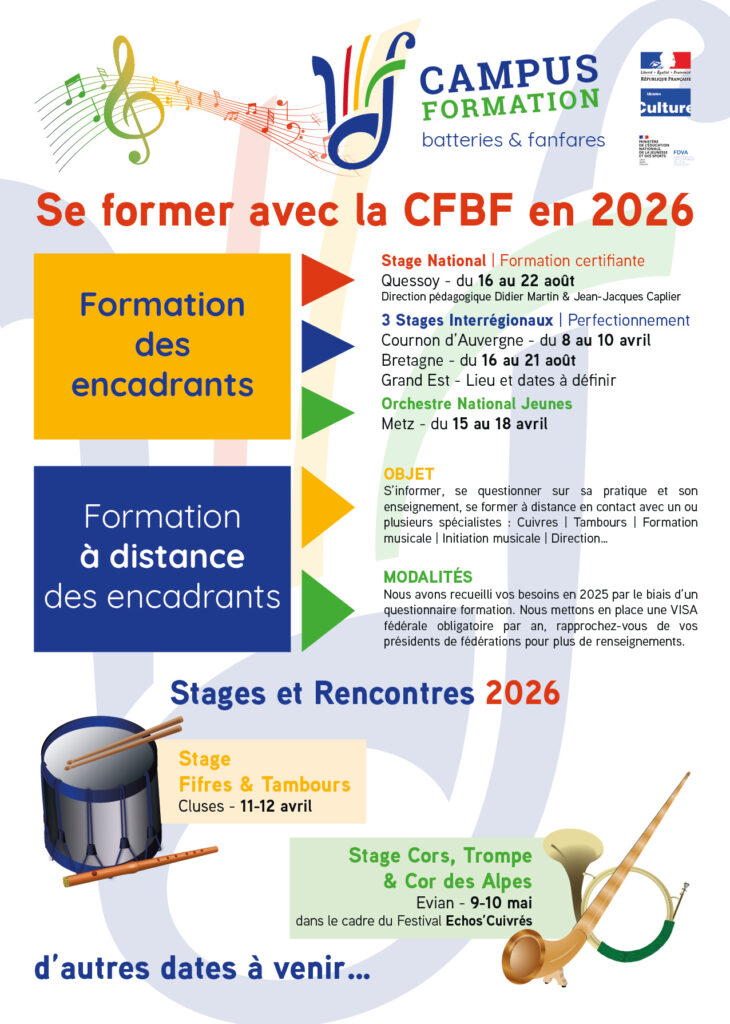 Pour l’enseignement individuel, la CFBF propose un cursus adapté aux musiciens amateurs dans la pratique des instruments de batterie-fanfare et des cuivres à systèmes.