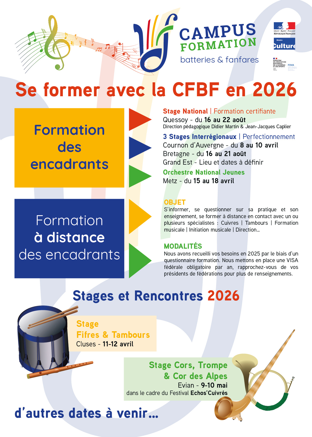 Le stage National regroupe chaque été tous les jeunes (et moins jeunes) qui ont décidé de se consacrer à la transmission de la musique dans leur association. Cette formation, basée sur l’acquisition d’unités de valeur, peut être préparée en 2 ou 3 ans si nécessaire. Un examen en valide les acquis. Il est également possible de participer comme auditeur libre, sans épreuves finales.