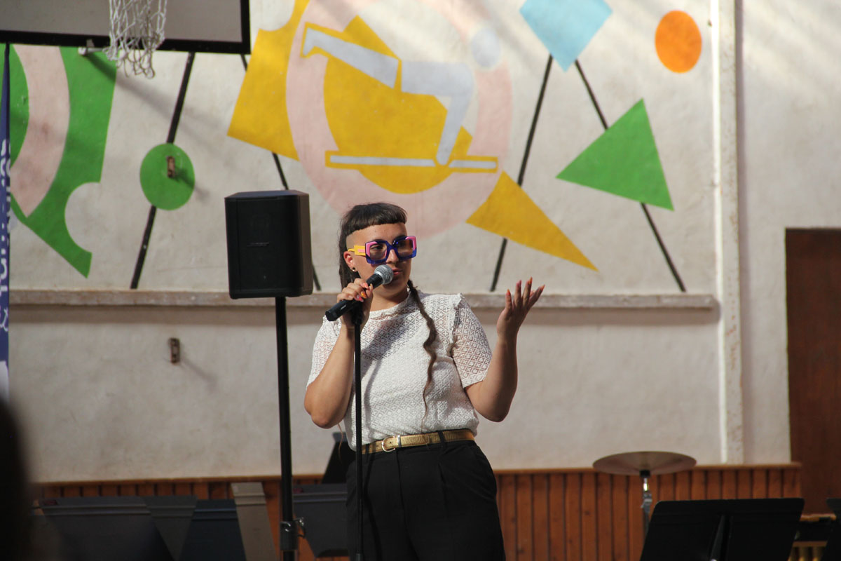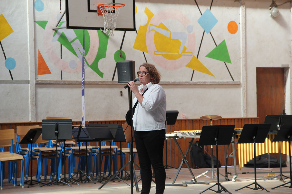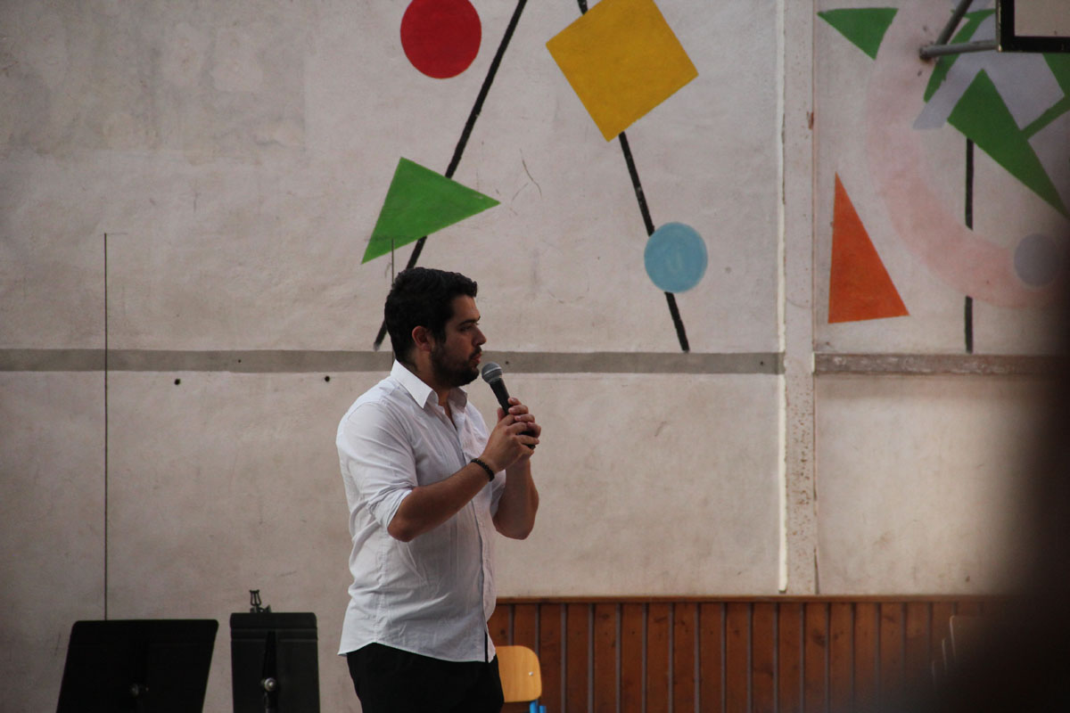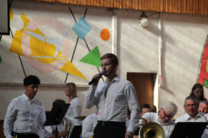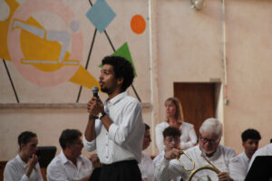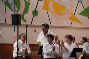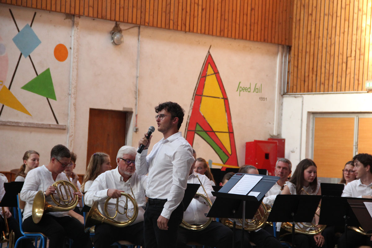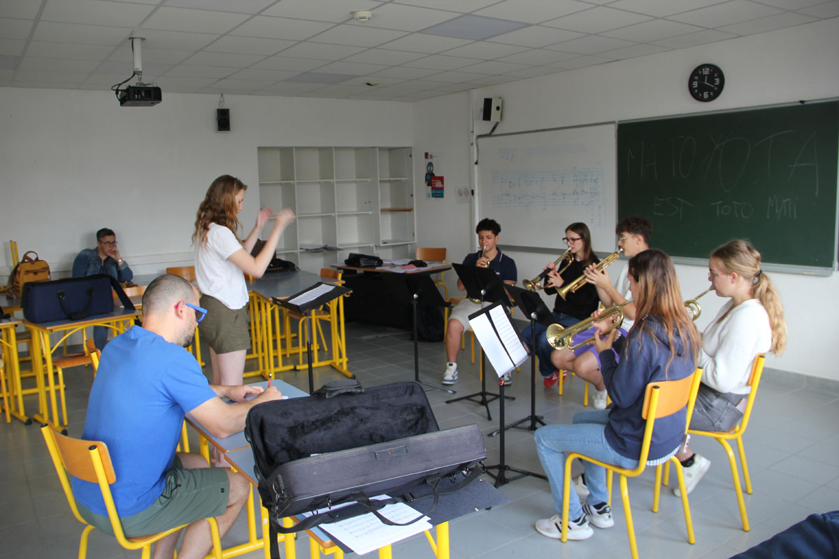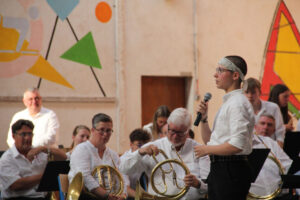 Ensuite, les stagiaires nationaux prennent place. C’est parti pour 10 morceaux dirigés par les stagiaires directeur musical. Chacun présente le morceau qu’il a à diriger. Improvisation, textes préparés ou présenté avec humour, les morceaux et les directeurs s’enchaînent au pupitre.