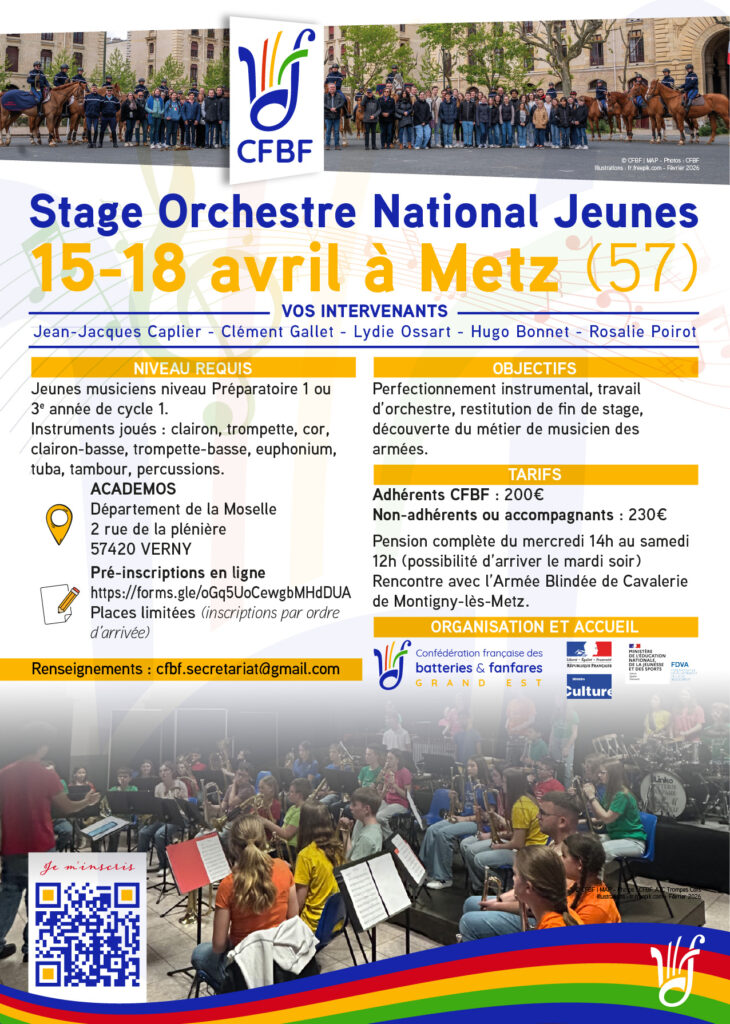 C’est la fédération Grand Est qui accueillera le stage Orchestre National des Jeunesà Metzcette année du 15 au 18 avril, du mercredi 14h au samedi 12h.